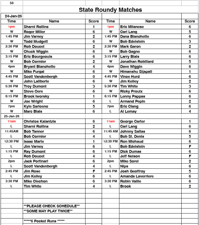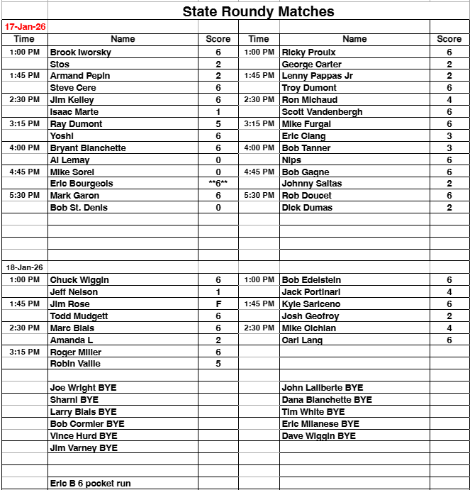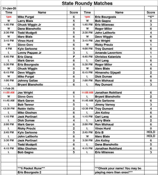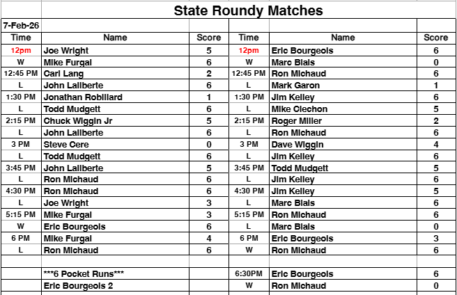 Other information Singles Scoresheet 6 Player Friday Scoresheet Singles Scoresheet Hall of Fame Overview of the game 2023 QCPL Rules Rating Criteria The Suncook Shot The longest recorded game Photo Galleries from past QCPL Roundy Tournaments - Thanks Steve Booth! |
